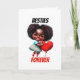 An adorable african american girl with the cutest afro hair style is smiling broadly and is holding a red heart balloon shape up to her cheek. She is wearing a summer pale blue and white striped short sleeve dress and pretty red shoes. The words "besties forever" appear in a bold black and red text around her and is set against a white background. This is ideal for girls who are best friends wanting to express how they feel about each other, for kids wanting to say a cute "Happy Valentine's day" to a classmate or for girlfriends saying "Happy birthday" to each other. Personalise the inside which is blank with your custom message.