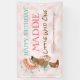 Little vintage girl in ruffled pants, native headdress and moccasins holding a dream catcher with arrow embellishment. Blush pink and aqua tones.