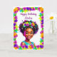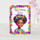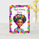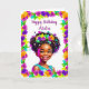 Pretty little girl of colour with yellow, purple and pink flowers in her hair. Add name in personalise area. Colouring page on the inside.