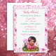 Cute personalised baby shower invitations with a cute African-American baby girl with a pink flower in her hair, Pretty pink floral background with pink and green text.