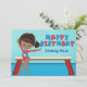 This cute custom African American girls gymnastics birthday card features a pretty black gymnast girl standing in front of a beam. She is wearing a red leotard and smiling to next to her beautiful blue monogram.