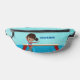 This cute gymnastics girl fanny pack features a pretty African American gymnast girl standing in front of a beam. This black little girl is wearing a red leotard and smiling above her beautiful blue personalised name.