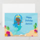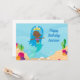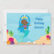 Cute custom black mermaid happy birthday card that features an adorable blue haired African American girl with a cool teal tail swimming next to beautiful bright coral in the ocean. Cool summer birthday card for a pool party or beach girl.