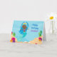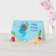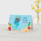 Cute custom black mermaid happy birthday card that features an adorable blue haired African American girl with a cool teal tail swimming next to beautiful bright coral in the ocean. Cool summer birthday card for a pool party or beach girl.