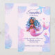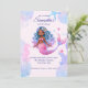 This invitation features an undersea theme in pink, purple, and blue. At its heart is a brown-skinned mermaid with a pink tail and multicolor hair, perfect for birthday black girls and more! Also featured is a seahorse, starfish, and other sea elements.