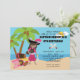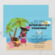 This pirate birthday party invitation features a cute African Americn girl dressed up as a pirate standing under a palm tree with her treasure map and a chest full of pirate booty.