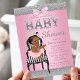 African American princess baby shower invitation with ethnic African American baby girl wearing a pretty pink tutu and string of pearls and diamond crown sitting on a chic black and white stripe chair on an elegant pink and silver glitter background. This modern pink and silver gray African American princess baby shower invitation is easily customized for your event by simply adding your details in the font style and color of your choice. You can remove the pink background color and add the color of your choice. This is a printed design with no real glitter, bows, etc.