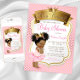 African American princess ballerina baby shower invitation with adorable ethnic African American baby girl wearing a cute pink tutu and pearls with pretty pink and gold crown on a beautiful pink and gold background. These adorable pink and gold baby shower invitations are easily customised for your event by simply adding the text of your choice in the font style you prefer.