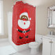 African-American Santa Claus Christmas custom shower curtain that features a cute whimsical black Santa Claus and snowflakes on red background accented with a black and white border.