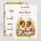 Cute baby twin girls of colour pink floral baby shower invitations. Watercolor baby girls sitting in pink flowers.