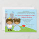 Cute princess & prince birthday invitations with blue polka dot background and castle.