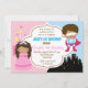 Cute split invitation for twins / siblings, in dual / duo theme: princess & superhero with african american boy & girl.