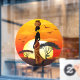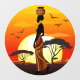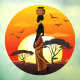 Beautiful Woman African Silhouette dressed with Wax traditional Fabric Dress, carrying a hand made decorated jar, Walking in the Amazing Nature of the African Savanna, on a warm and Peaceful Sunset. Original Vector Illustration Copyright BluedarkArt TheChameleonArt.