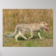 Profile African Cheetah (Acinonyx jubatus) walking on grass with meat in his mouth