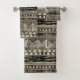 A bathroom towel set with a geometric pattern inspired by traditional motifs from Africa. It's hand drawn with a black ink pattern and neutral background colours. This design incorporates stripes, squares, triangles, dots, and more shapes. It also has a distressed texture for a rustic feeling. Resize the pattern on each towel and add any text if desired. Unique bath towels for anyone that loves African culture! Would be perfect for a rustic style bathroom!
