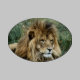 Oval shape photo of African male lion lying down in weeds.