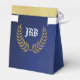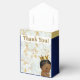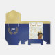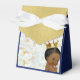 Royal African Prince Baby Shower Favour tent box with royal blue , gold and marble  front with adorable ethnic prince wearing a gold crown. Back features gold crest surrounding personalised initials in white.