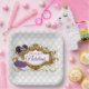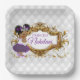 Adorable African American Princess with cute curly afro puffs, in a purple and white ruffle dress with purple hair bows and ballet slippers, wearing a diamond tiara. Great for Royal Princess Birthday or Royal Princess Baby Shower. White diamond patterned background. Add your own name or centred text. ©2022 Miss Sassy Party Designs