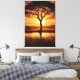 A serene African landscape at sunset, with a large acacia tree silhouetted against the setting sun. The golden light and lush vegetation create an atmosphere of tranquillity and natural beauty.