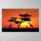 This image shows an idyllic sunset with giraffe and umbrella acacia
