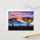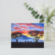 Postcard of an African sunset safari painting with animals and acacia trees. Painted black silhouette of acacia trees and elephants against a colourful blue, red, purple and yellow sunset in Africa. Perfect wanderlust postcard for a traveller! Original painting: Acrylics on canvas, 30 x 40 cm. 2011.