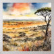 In this awe-inspiring watercolor portrayal, the vastness and grandeur of an African savanna come to life with vivid detail. The artist's meticulous brushwork captures the expanse of the open landscape, where the untamed beauty of the wild thrives beneath the boundless African sky.