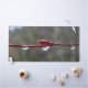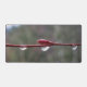 Fresh raindrops cling to a slender red branch, suspended against a soft, blurred background. The simple composition highlights texture, light, and the quiet detail of a moment after rain.