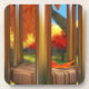 After the wind a single fallen leaf lies where it fell on a silent wind chime. On the ground beneath the still-green grass is covered with yellow and red leaves. In the background a crimson and gold autumn orchard reflects its colours in the silver bars of the chime.