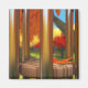 After the wind a single fallen leaf lies where it fell on a silent wind chime. On the ground beneath the still-green grass is covered with yellow and red leaves. In the background a crimson and gold autumn orchard reflects its colours in the silver bars of the chime.