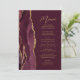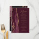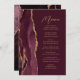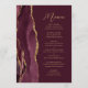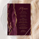 This elegant modern wedding menu features a burgundy red watercolor agate border trimmed with faux gold glitter. The customisable text combines gold-coloured handwriting script and sans serif fonts on a burgundy background. The burgundy and gold agate design is repeated on the reverse side.
