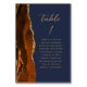The left-hand edge of this elegant modern wedding table number card features a burnt orange watercolor agate border trimmed with faux gold glitter. The word "table" appears in gold-coloured handwriting script on a navy blue background. Add the names of your guests who are assigned to each table.