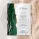 This elegant modern wedding menu features an emerald green watercolor agate border trimmed with faux gold glitter. The customizable text combines charcoal gray handwriting script and sans serif fonts on a white background. The green and gold agate design is repeated on the reverse side.