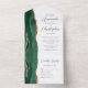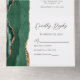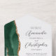 The left-hand edge of this elegant modern all-in-one wedding invitation and RSVP features an emerald green watercolor agate border trimmed with faux gold glitter. The customisable text combines charcoal grey handwriting, copperplate and italic fonts on a white background. The return address appears on the outside flap and the reverse side of the detachable RSVP card in charcoal grey text on solid white.