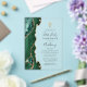 The left-hand edge of this elegant modern first communion invitation features an emerald green watercolor agate border trimmed with faux gold glitter. A faux gold foil cross appears above the customisable text, which combines handwriting, copperplate and italic fonts in charcoal grey on a clear background.