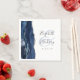 These elegant modern wedding napkins feature a navy blue watercolor agate geode design trimmed with faux silver glitter. Easily customise the charcoal grey text on a white background, with the names of the bride and groom in handwriting calligraphy over a large, pale blue ampersand.