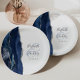 These elegant modern wedding plates feature a navy blue watercolor design trimmed with faux silver glitter. Easily customise the charcoal grey text on a white background, with the names of the bride and groom in handwriting calligraphy over a large pale blue ampersand.