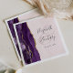 These elegant modern wedding napkins feature a purple watercolor design trimmed with faux gold glitter. Easily customise the charcoal grey text on a white background, with the names of the bride and groom in handwriting calligraphy over a large ampersand on a blush pink background.