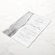 The left-hand edge of this elegant modern wedding invitation features a grey watercolor agate border trimmed with faux silver glitter. The customisable text combines script and sans serif fonts in real silver foil on a white background. The reverse side features a matching agate design.