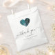 These elegant modern wedding favour bags feature a heart shape filled with a teal blue watercolor agate and faux gold glitter design. The words "thank you" appear in elegant charcoal grey handwriting script with swashes at the beginning and end. Customise the message and add the names of the couple and wedding date.