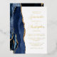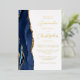 The left-hand edge of this elegant modern wedding invitation features a navy blue watercolor agate border trimmed with faux gold glitter. The customisable text combines script and sans serif fonts in real gold foil on a white background. The reverse side features a matching agate design.