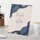 A chic, elegant sign to thank wedding guests at your Cards and Gifts table. The words "Cards" and "Gifts" appear in charcoal grey handwriting calligraphy, with "thank you!" below in serif font. Navy blue watercolor agate designs trimmed with rose gold faux glitter frame the message in two corners on a blush background. See our collection for matching wedding invitation suite and day-of stationery.