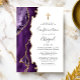 The left-hand edge of this elegant modern Confirmation invitation features a purple watercolor agate border trimmed with faux gold glitter. A faux gold foil cross appears above the customisable text, which combines handwriting, copperplate and italic fonts in charcoal grey on a white background. The reverse side features a matching purple and gold agate design.