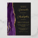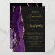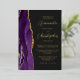 The left-hand edge of this elegant modern wedding invitation features a purple watercolor agate border trimmed with faux gold glitter. The customisable text combines script and sans serif fonts in real gold foil on a dark background. The reverse side features a matching agate design.