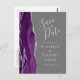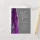 This elegant modern save the date postcard features a purple watercolor agate border trimmed with faux silver glitter. The customisable text is light silver grey on a grey background. The reverse side repeats the information, along with a customisable return address.