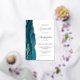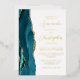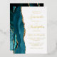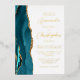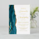The left-hand edge of this elegant modern wedding invitation features a teal blue watercolor agate border trimmed with faux gold glitter. The customisable text combines script and sans serif fonts in real gold foil on a white background. The reverse side features a matching agate design.