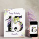 Personalised 15th Birthday Card with age number 15. This floral design has a bold number 15 decorated with wisteria flowers and foliage in shades of purple, lilac, pink and green. The template is set up for you to personalise the name on the front and the message inside.
