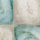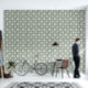 Original digital watercolor painting on this wallpaper mimics the look of aged clay tiles in shades of bone white and aqua laid out in a chequerboard pattern, and each w/a different faded hand-painted botanical image such as white hydrangea, pale pink roses, orchids, and various feathery greenery.