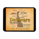 Aged antique paper Delaware state pride image including map silhouette with cities, towns and nickname.