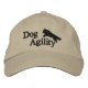 This embroidered hat has a black jumping Shetland Sheepdog silhouette over the word "Agility," with "Dog" on the other side. Fantastic Sheltie hat for anyone who trials with their herding breed.