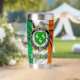 Ahearne/Aherne Irish coat of arms shield, enclosed within a black and white badge, is handsomely displayed on this insulated tumbler. Featuring the Irish flag in the background, this tumbler keeps cold drinks cold and hot drinks hot! Take to work, family gatherings, give as a gift and best yet, have your favourite drink "on the go". Can be personalised too! Erin go Bragh!
